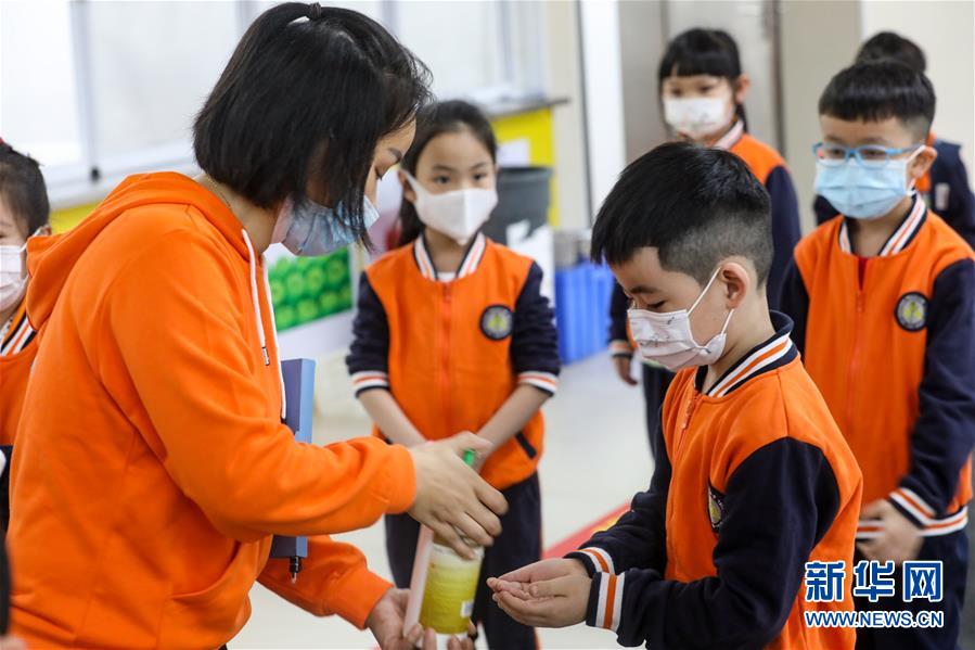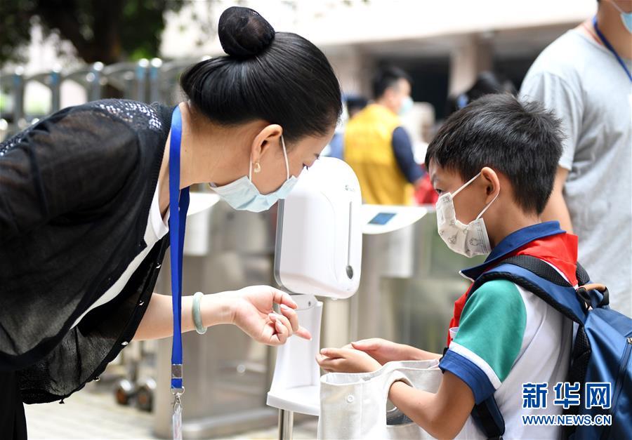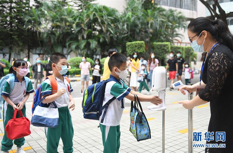 5月25日,廣州市荔灣區(qū)蔣光鼐紀(jì)念小學(xué)的老師在校門口指導(dǎo)返校的學(xué)生進(jìn)行手部消毒。當(dāng)日,廣州市各小學(xué)一至三年級學(xué)生正式開學(xué)復(fù)課。至此,廣州市中小學(xué)各年級已全部開學(xué)復(fù)課。新華社記者盧漢欣攝
