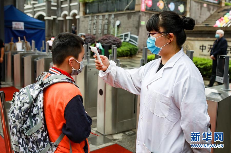 5月25日,貴陽市中天北京小學(xué)未來方舟校區(qū)學(xué)生在返校時(shí)進(jìn)行體溫檢測。新華社記者歐東衢攝
