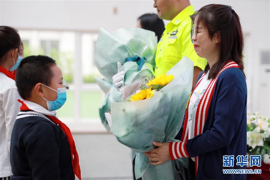 5月25日,北京市朝陽區(qū)實(shí)驗(yàn)小學(xué)貴陽分校的學(xué)生在上開學(xué)第一課時(shí),為前來講課的抗疫醫(yī)生送上鮮花。新華社記者劉續(xù)攝