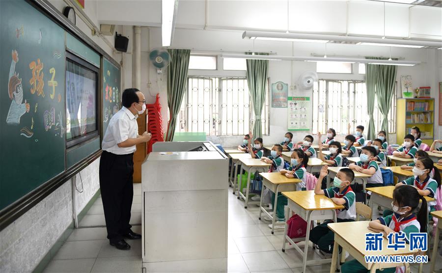 5月25日,廣州市荔灣區(qū)蔣光鼐紀(jì)念小學(xué)的老師在給學(xué)生上開學(xué)第一課。當(dāng)日,廣州市各小學(xué)一至三年級學(xué)生正式開學(xué)復(fù)課。至此,廣州市中小學(xué)各年級已全部開學(xué)復(fù)課。新華社記者盧漢欣攝