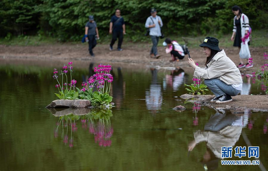 5月24日,在四川省漢源縣桌子山,一名游客在水邊拍報(bào)春花。