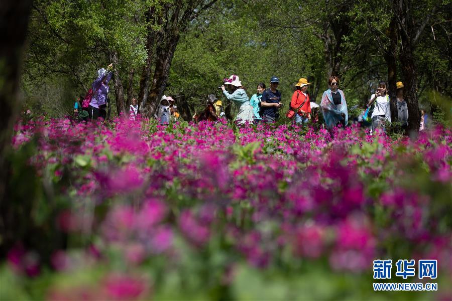 5月24日,游客在四川省漢源縣桌子山上觀賞報春花。新華社記者江宏景攝
