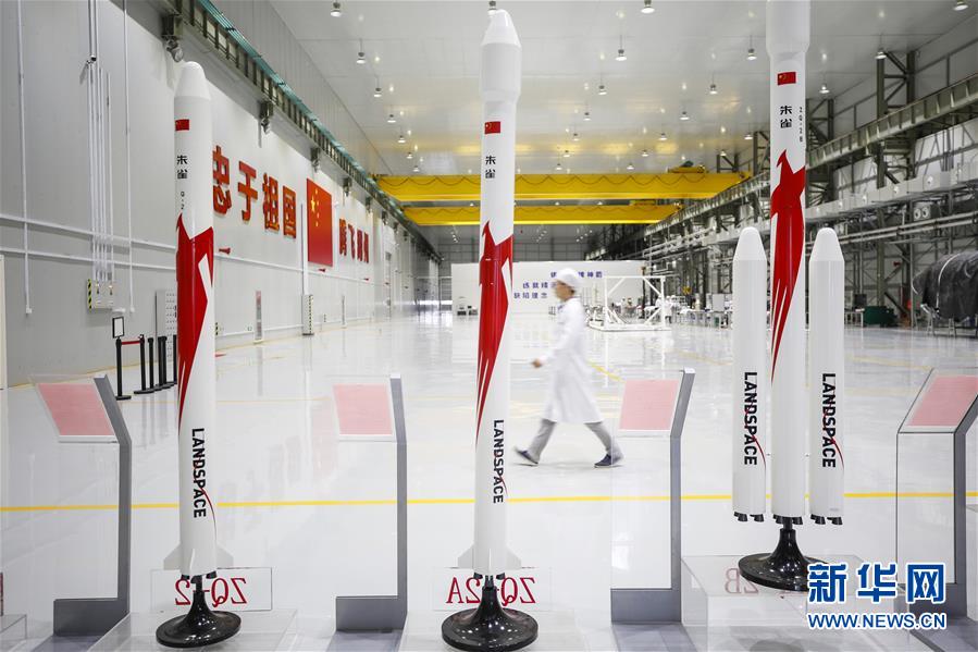 5月26日,工作人員走過藍(lán)箭航天智能制造基地發(fā)動(dòng)機(jī)裝配區(qū)內(nèi)的火箭模型。新華社記者張玉薇攝