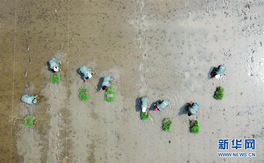 這是5月22日拍攝的農(nóng)民在寧安市渤海鎮(zhèn)上官地村一塊稻田中插秧(無(wú)人機(jī)照片)。新華社記者王建威攝