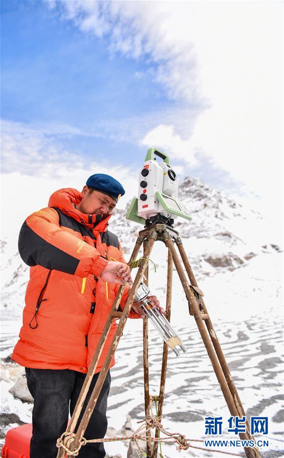 自然資源部第一大地測量隊(duì)隊(duì)員鄭林在使用全站儀對珠峰峰頂進(jìn)行交會(huì)觀測(5月27日攝)。新華社記者孫非攝