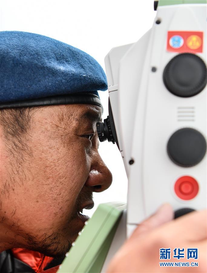 自然資源部第一大地測量隊(duì)隊(duì)員鄭林在使用全站儀對珠峰峰頂進(jìn)行交會(huì)觀測(5月27日攝)。新華社記者晉美多吉攝
