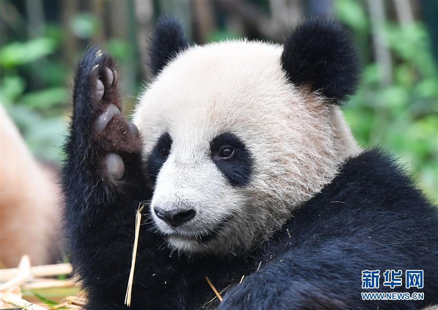 5月27日,被搶走竹子的大熊貓婷仔“舉手”望向飼養(yǎng)員。正在享受竹子大餐的廣州長(zhǎng)隆野生動(dòng)物世界大熊貓婷仔被大熊貓隆仔搶食,兩只大熊貓上演一場(chǎng)爭(zhēng)食戲碼。新華社記者劉大偉攝