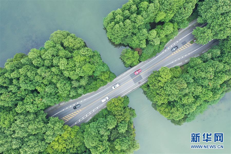 5月27日,車輛行駛在西湖楊公堤上(無人機(jī)照片)。隨著氣溫升高,杭州西湖綠意蔥蘢,展現(xiàn)出柔美的湖光山色。新華社記者翁忻旸攝
