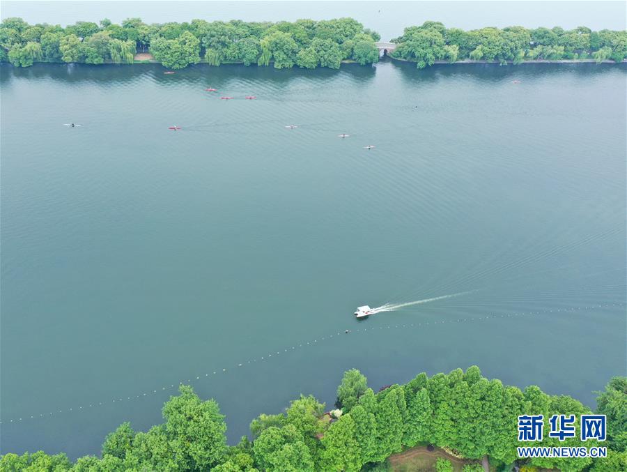 5月27日,船只在西湖湖心亭附近行駛(無人機照片)。隨著氣溫升高,杭州西湖綠意蔥蘢,展現(xiàn)出柔美的湖光山色。新華社記者翁忻旸攝