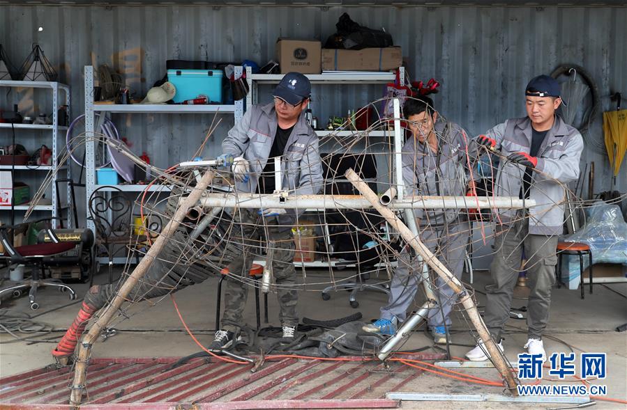 5月27日,制作團隊成員郭宇(左)、劉景強(中)和李剛在中轉(zhuǎn)服務(wù)站工棚內(nèi)工作。新華社記者方喆攝