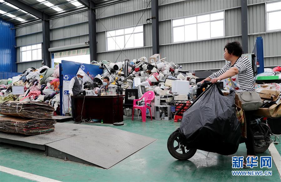 5月27日,一位街道居民將自己日常收集到的可回收物送到中轉(zhuǎn)服務(wù)站。新華社記者方喆攝