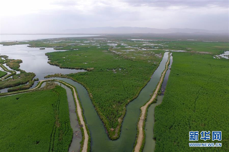 這是5月20日拍攝的新疆博湖縣博斯騰湖邊的蘆葦(無人機(jī)照片)。新華社記者宋彥樺攝