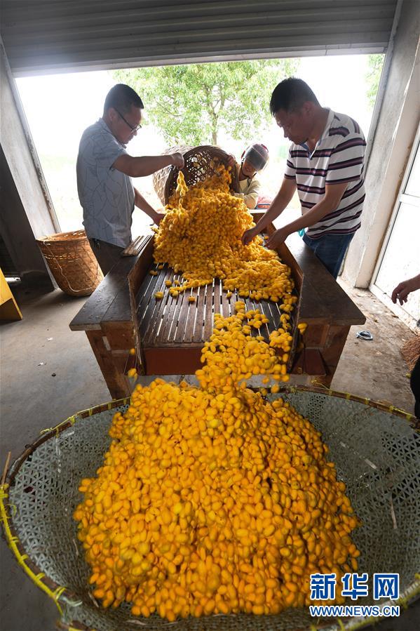 5月27日,桐鄉(xiāng)市鳳鳴街道建勝村70歲的村民宋柏明在收獲“黃金繭”。他今年在桐鄉(xiāng)興民蠶業(yè)專業(yè)合作社的指導下首次養(yǎng)3張黃金蠶繭種,收獲“黃金繭”近400斤,比往年同期增收1500元。近期,蠶桑之鄉(xiāng)浙江省桐鄉(xiāng)市的蠶農(nóng)們迎來了蠶繭豐收的季節(jié),其中新品種“黃金繭”的增收效果尤其明顯。據(jù)介紹,與普通蠶絲相比,色澤金黃的黃金蠶絲中葉黃素含量高,抗菌效果更好,深受市場青睞。2020年春季,浙江省桐鄉(xiāng)市共計發(fā)放黃金蠶繭種1225張,產(chǎn)量預計75噸,總產(chǎn)值近300萬元,較普通蠶繭增收約20%,成為當?shù)剞r(nóng)業(yè)增收的亮點。浙江省桐鄉(xiāng)市是我國蠶桑的重要產(chǎn)地,“桐鄉(xiāng)蠶桑習俗”也被國務(wù)院列入第二批國家級非物質(zhì)文化遺產(chǎn)名錄。新華社記者徐昱攝