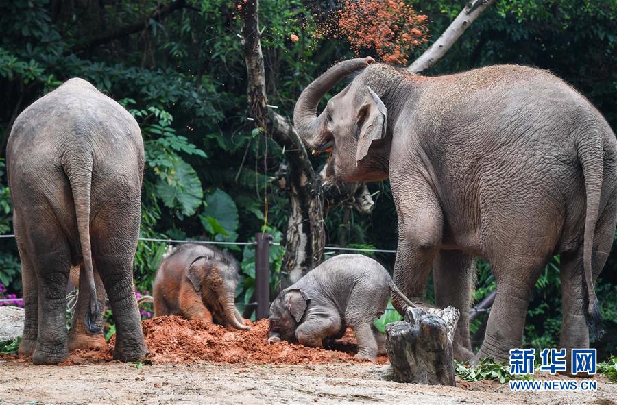 5月27日,廣州長隆亞洲象媽媽卷起紅泥撒在身上,這些泥土可以幫助大象護(hù)理皮膚和補(bǔ)充鹽分。新華社記者劉大偉攝