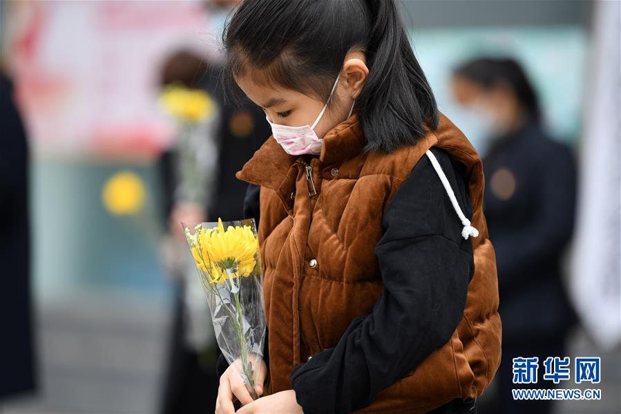 安徽肥西,一名小女孩在哀悼活動上默哀(4月4日攝)。新華社記者劉軍喜攝
