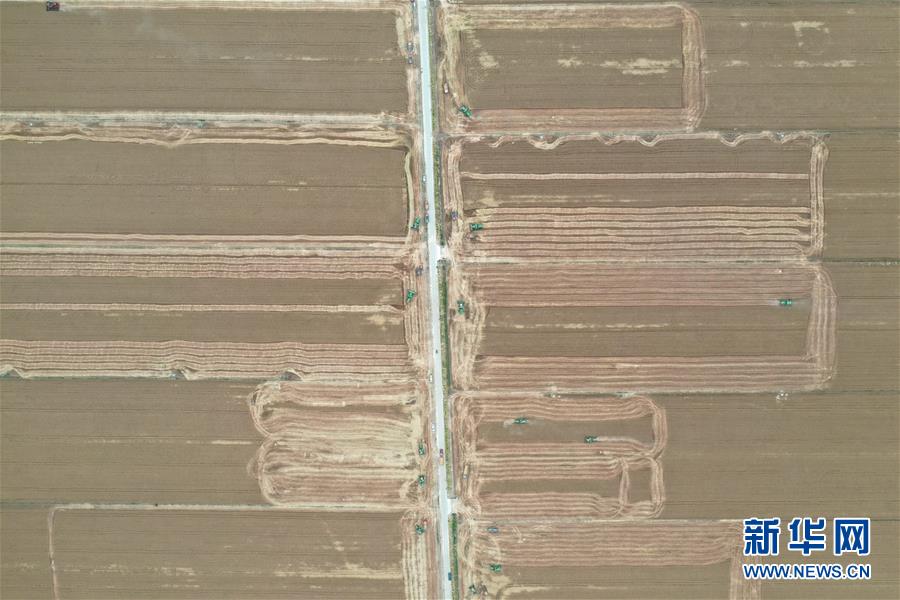6月2日,在河南省黃泛區(qū)農(nóng)場(chǎng)九分場(chǎng)的麥田里,農(nóng)民操作大型收割機(jī)收獲小麥(無人機(jī)照片)。新華社記者馮大鵬攝。