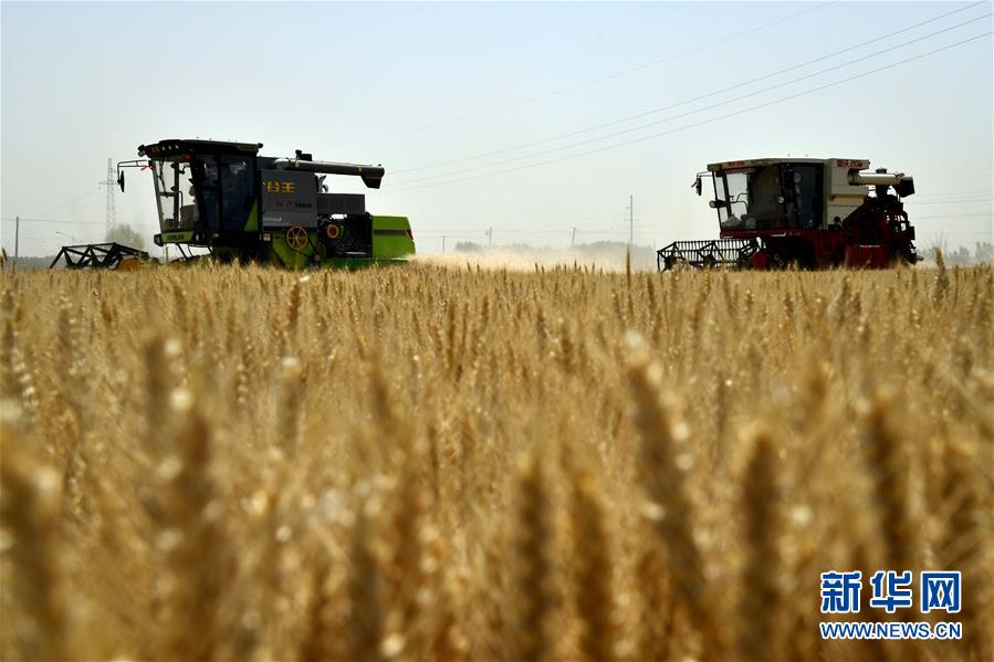 6月3日,在汶上縣郭倉(cāng)鎮(zhèn),收割機(jī)在收獲小麥。目前,我國(guó)第二大小麥主產(chǎn)區(qū)山東6000多萬(wàn)畝小麥進(jìn)入收獲階段。農(nóng)民們搶抓有利天氣,自南向北陸續(xù)開(kāi)鐮。新華社記者郭緒雷攝。