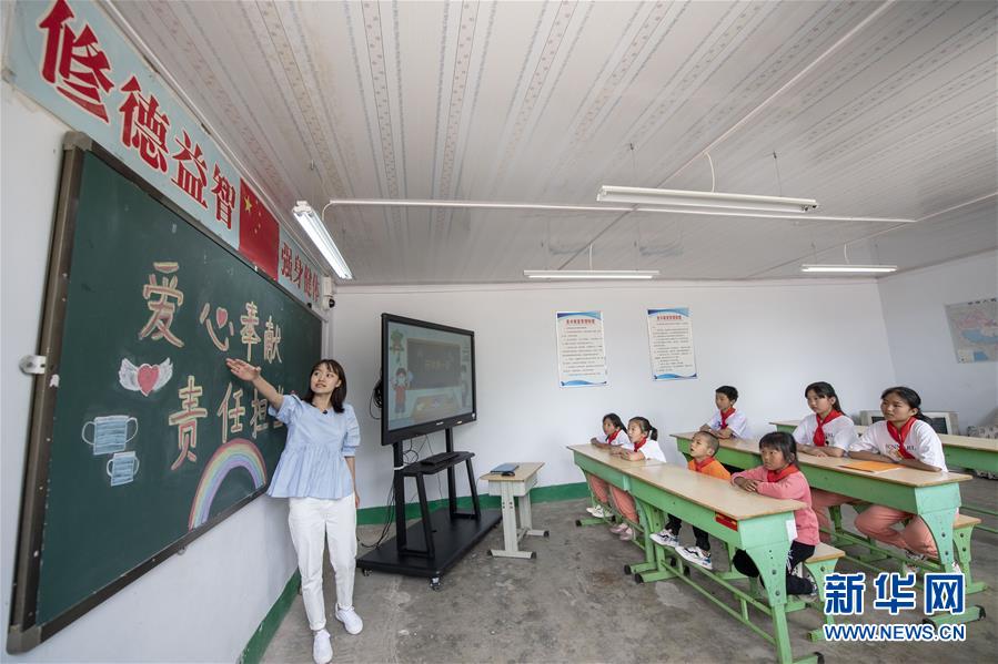 6月2日,馬武寨寄小學的英語老師陳燕子為學生們上開學第一課。新華社記者楊晨光攝。