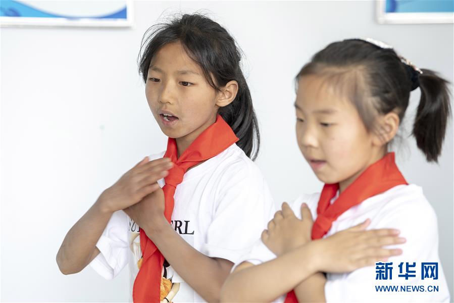 6月2日,在開學第一課上,秦秋蘭(左)在做練習手語操。新華社記者楊晨光攝。