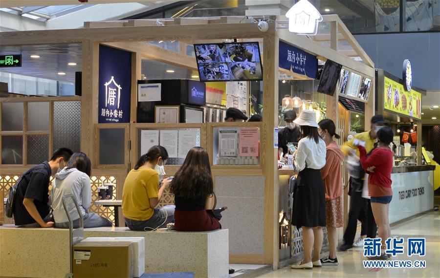 6月3日,市民及游客在西單大悅城商場(chǎng)內(nèi)購(gòu)買(mǎi)食品。近日,游人和市民紛紛來(lái)到北京市的王府井、西單、前門(mén)大街等著名商業(yè)街購(gòu)物休閑,這些老商業(yè)街開(kāi)始逐步恢復(fù)昔日的繁華。新華社記者李欣攝。