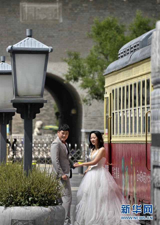 6月3日,一對年輕人在前門步行街拍攝婚紗照片。近日,游人和市民紛紛來到北京市的王府井、西單、前門大街等著名商業(yè)街購物休閑,這些老商業(yè)街開始逐步恢復昔日的繁華。新華社記者李欣攝。