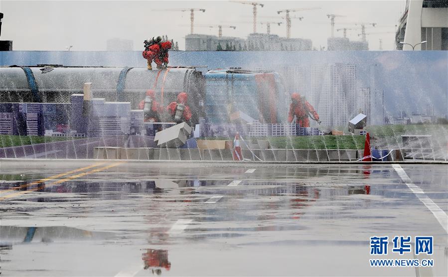 6月3日,救援人員在演練中使用水幕阻擋?;窋U散。新華社記者方喆攝。