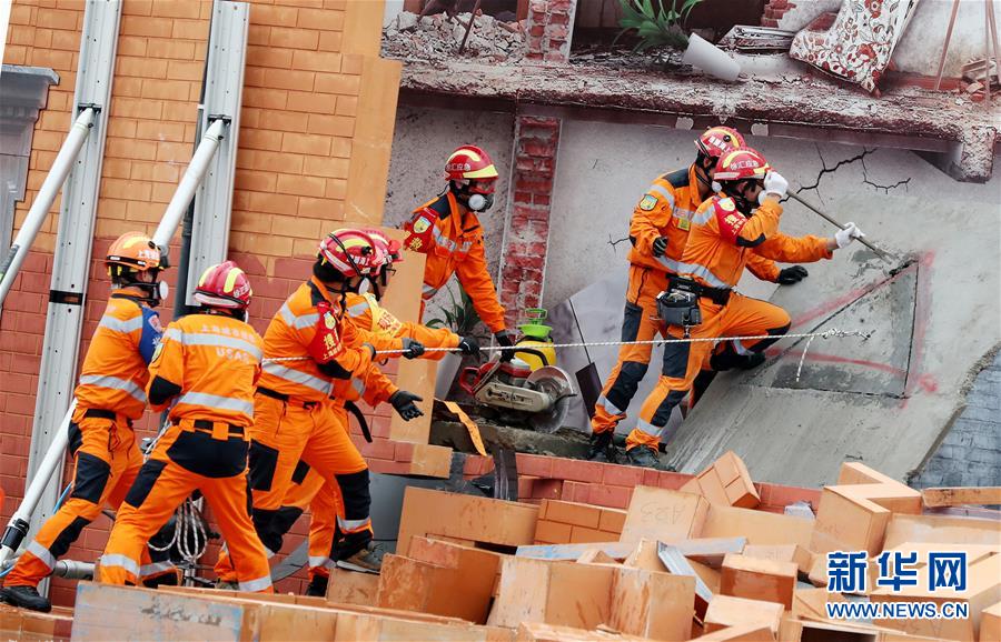 6月3日,救援人員在演練中對倒塌墻體進行破拆。新華社記者方喆攝。