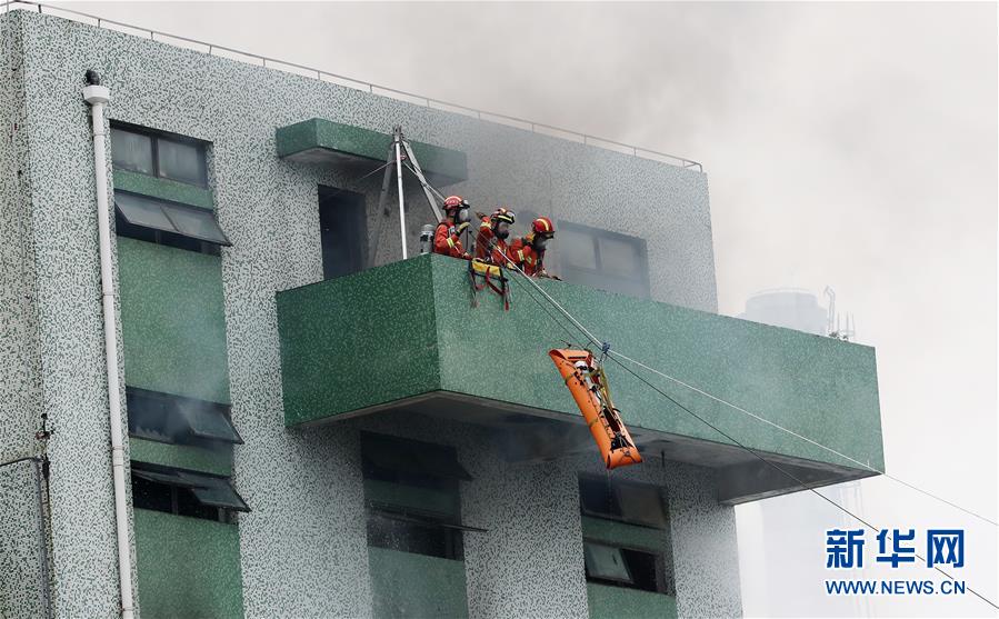6月3日,救援人員在演練中使用索降營救“被困”人員。新華社記者方喆攝。
