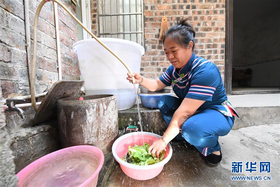 在廣西環(huán)江毛南族自治縣下南鄉(xiāng)下南社區(qū)松朗屯,覃鳳增在用自來水洗菜(5月22日攝)。新華社記者陸波岸攝。