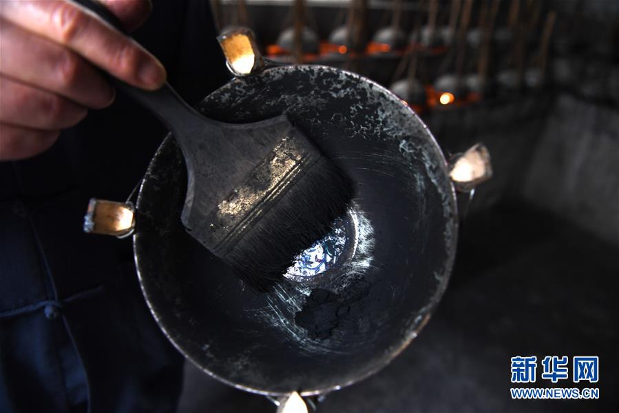 5月21日,安徽省非物質(zhì)文化遺產(chǎn)徽墨代表性傳承人項(xiàng)德勝收集集煙碗中的桐油煙灰。新華社記者張端攝。