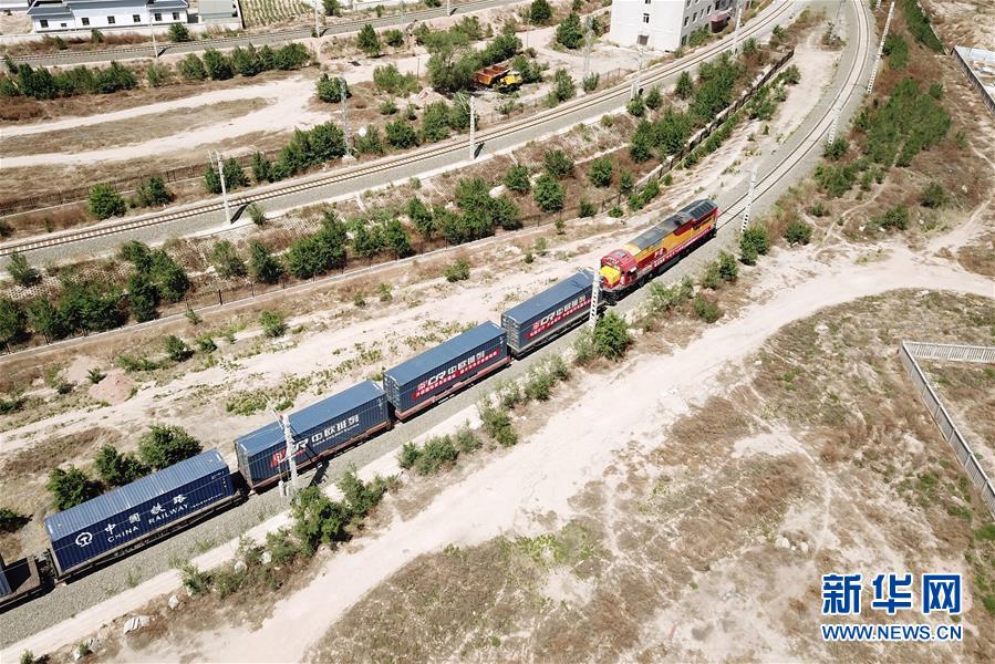 6月5日,在甘肅蘭州國(guó)際陸港,“中吉烏”公鐵聯(lián)運(yùn)國(guó)際貨運(yùn)班列準(zhǔn)備發(fā)車(chē)(無(wú)人機(jī)照片)。新華社記者范培珅攝。