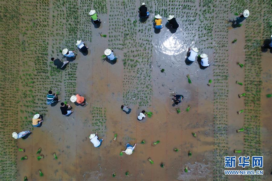 6月7日,孩子和家長們體驗稻田插秧(無人機(jī)照片)。新華社記者徐昱攝