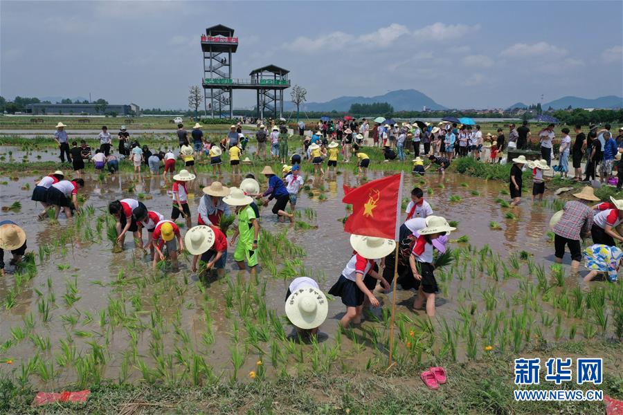 6月7日,孩子和家長(zhǎng)們體驗(yàn)稻田插秧(無人機(jī)照片)。新華社記者徐昱攝