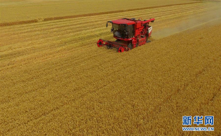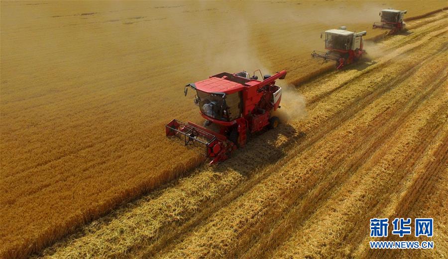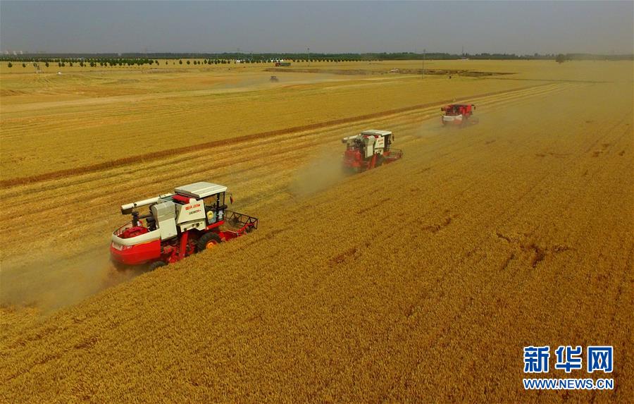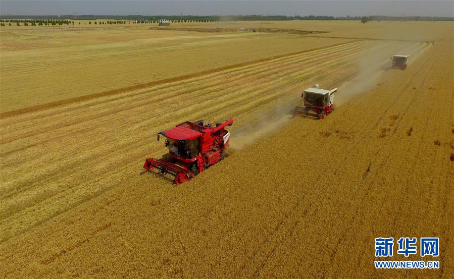 6月8日,聯(lián)合收割機(jī)在河北省南和縣閆里鄉(xiāng)閆里村麥田進(jìn)行夏收作業(yè)(無人機(jī)照片)?!叭摹逼陂g,河北省預(yù)計(jì)組織和調(diào)度小麥聯(lián)合收割機(jī)、拖拉機(jī)、夏玉米播種機(jī)等200萬臺農(nóng)業(yè)機(jī)械投入作業(yè)。新華社記者朱旭東攝