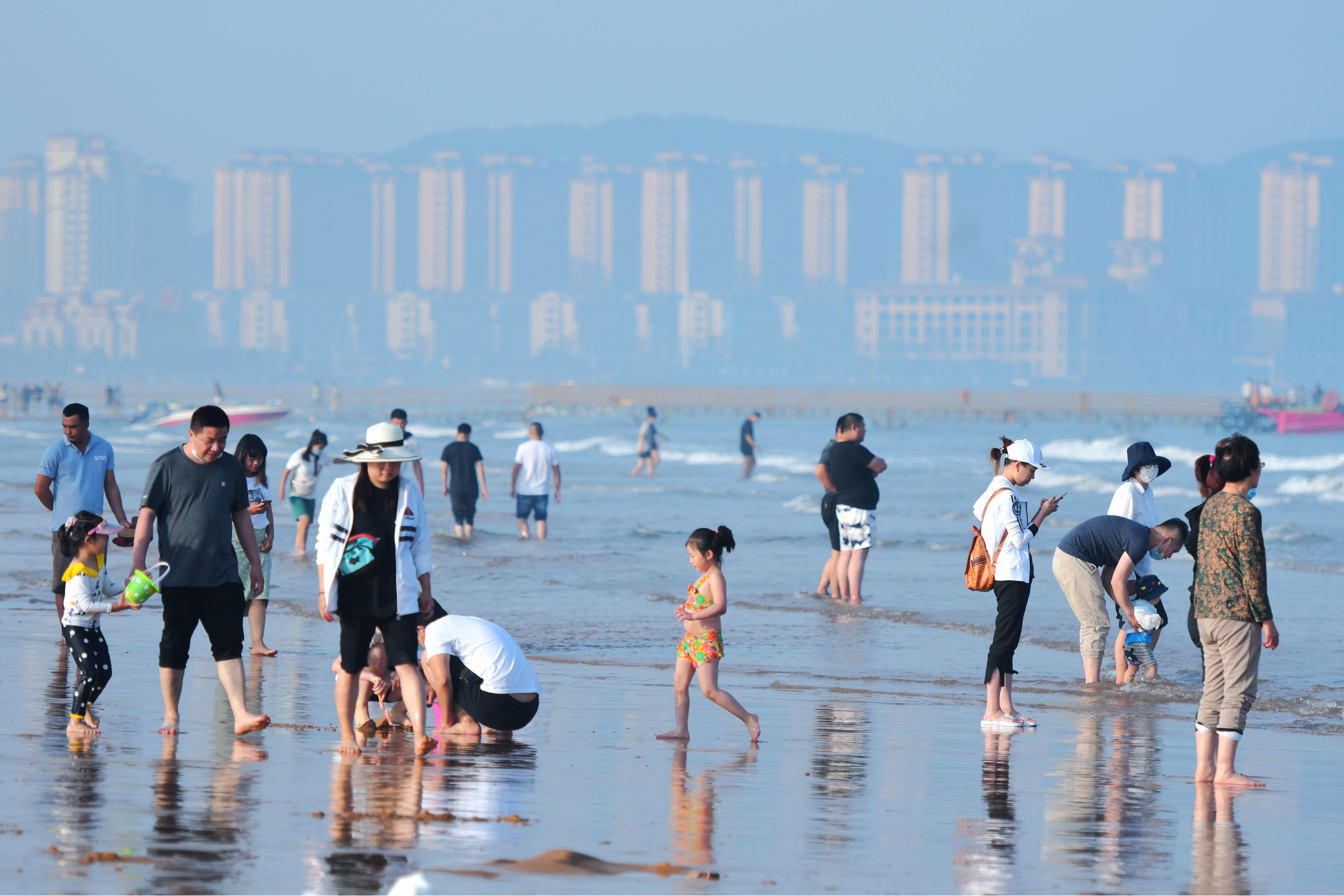 2020年6月3日,山東青島西海岸新區(qū)金沙灘海水浴場,游客在海水和沙灘間游玩。