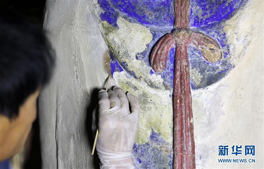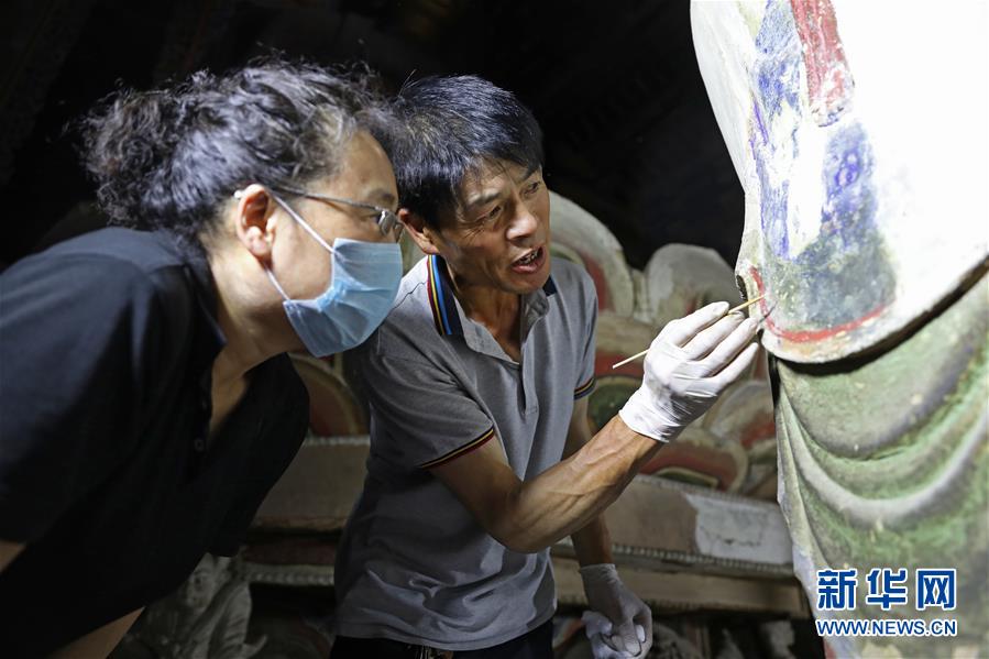 6月8日,工作人員對(duì)奉國寺的彩繪泥塑進(jìn)行保護(hù)修復(fù)。新華社記者姚劍鋒攝