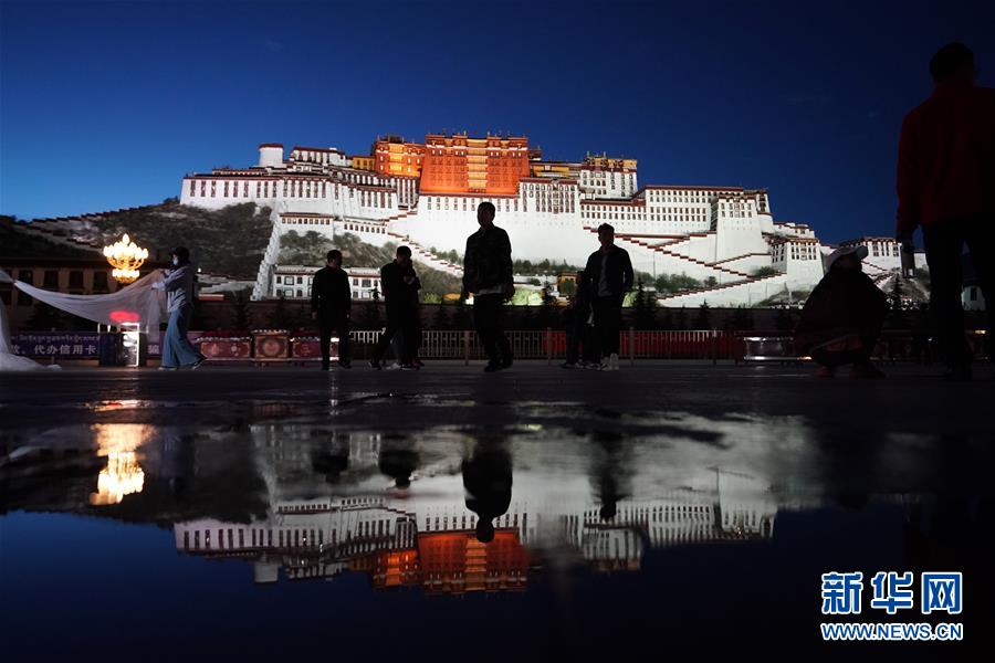 人們在布達拉宮廣場拍照(6月8日攝)。夜幕降臨,西藏拉薩布達拉宮燈光璀璨,夜景迷人。新華社記者詹彥攝