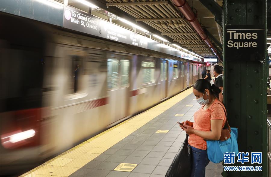 6月8日,佩戴口罩的乘客在美國紐約一地鐵站內(nèi)等車,地面上安置了保持社交距離的標(biāo)記。在因新冠疫情進入“居家令”近三個月之后,美國紐約市于當(dāng)?shù)貢r間8日開始“解封”,進入經(jīng)濟重啟的第一階段。新華社記者王迎攝