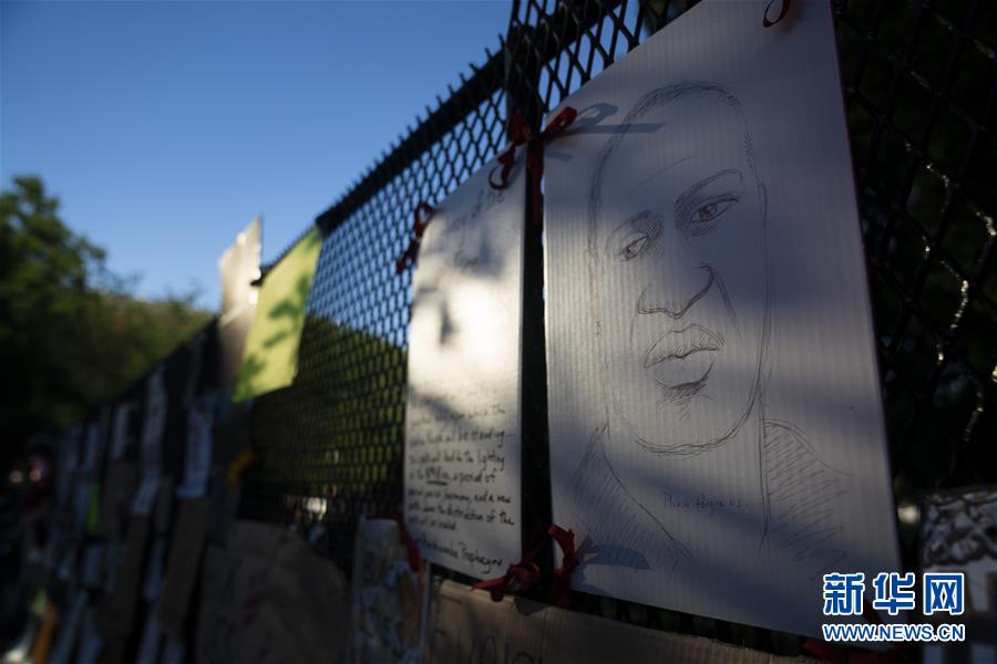 6月8日,美國(guó)華盛頓白宮附近的隔離圍欄上貼著喬治·弗洛伊德的畫(huà)像。新華社記者劉杰攝