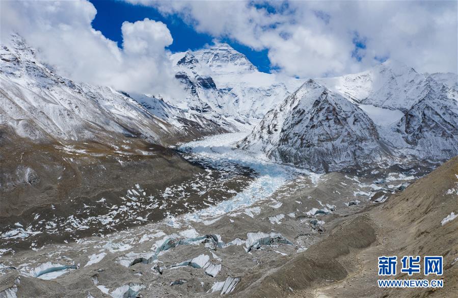 這是珠峰腳下的絨布冰川(無人機照片,4月30日攝)。從空中俯瞰珠穆朗瑪峰北坡,生機勃勃的高原濕地、蜿蜒曲折的盤山公路、壯麗秀美的絨布冰川,還有安靜的村莊和熱鬧的登山營地,共同構(gòu)成一幅壯美畫卷。新華社記者普布扎西攝