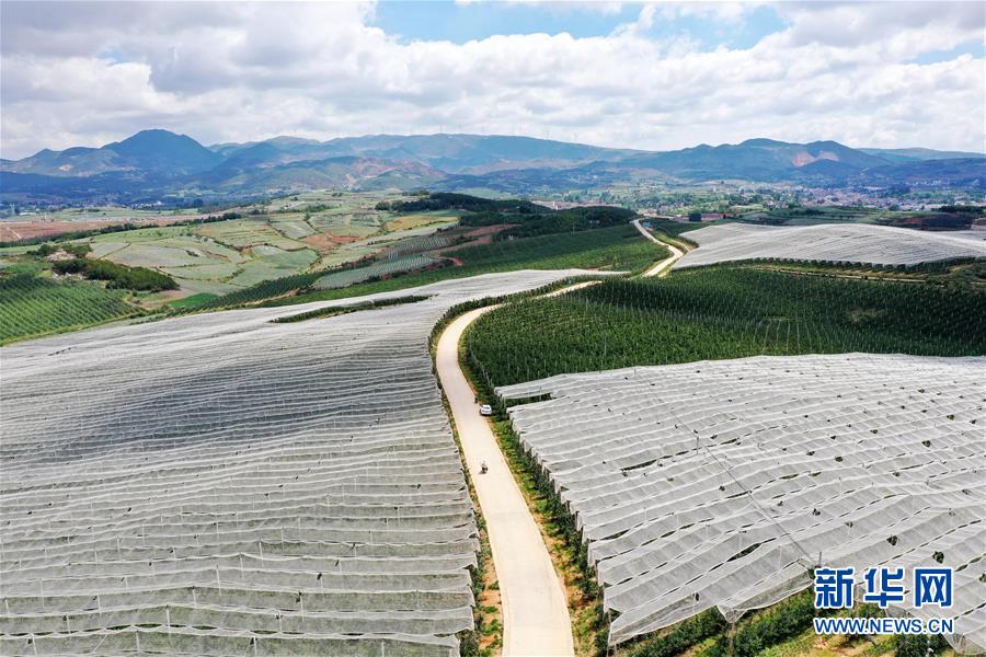 這是6月11日拍攝的貴州省威寧縣一處蘋果基地(無人機(jī)照片)。近日,貴州省威寧彝族回族苗族自治縣的農(nóng)民搶抓農(nóng)時,對蘋果園進(jìn)行疏果、除草等田間管理,呈現(xiàn)出一派夏管農(nóng)忙景象。威寧縣蘋果種植面積50余萬畝,蘋果產(chǎn)業(yè)已逐步成為當(dāng)?shù)剞r(nóng)民增收致富的主導(dǎo)產(chǎn)業(yè)之一。新華社記者楊文斌攝。
