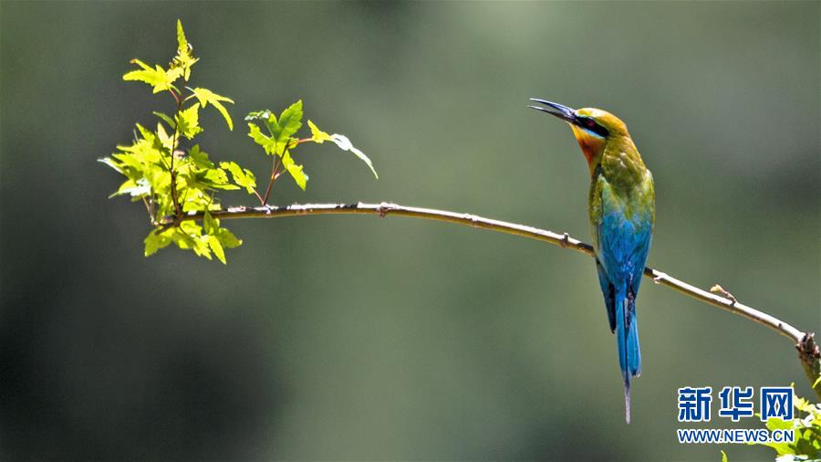 栗喉蜂虎在福建省晉江市深滬鎮(zhèn)科任村一山坡上覓食嬉戲(6月12日攝)。入夏以來,逾百只栗喉蜂虎飛臨閩南晉江市深滬鎮(zhèn)科任村筑巢棲息。新華社記者記者梅永存攝。
