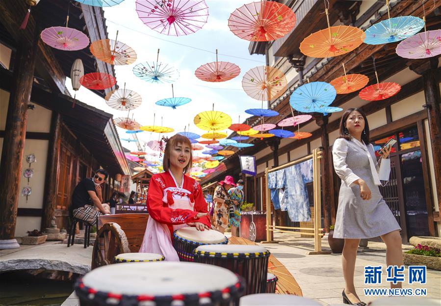 6月13日,在長春市世茂蓮花山小鎮(zhèn)寬厚里商街,一名古裝愛好者演奏手鼓。當日是“文化和自然遺產(chǎn)日”。吉林長春首屆蓮花山消夏生活節(jié)在世茂蓮花山小鎮(zhèn)舉行。活動將非遺展示與假日消暑休閑相結合,讓游人在“古色古香”的油紙傘巷中品傳統(tǒng)文化魅力,享夏日休閑愜意。新華社記者許暢攝。
