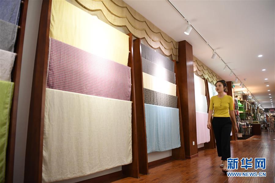 6月12日,天運(yùn)夏布會館負(fù)責(zé)人唐藝在檢查展廳內(nèi)展示的夏布樣品。新華社記者 唐奕 攝