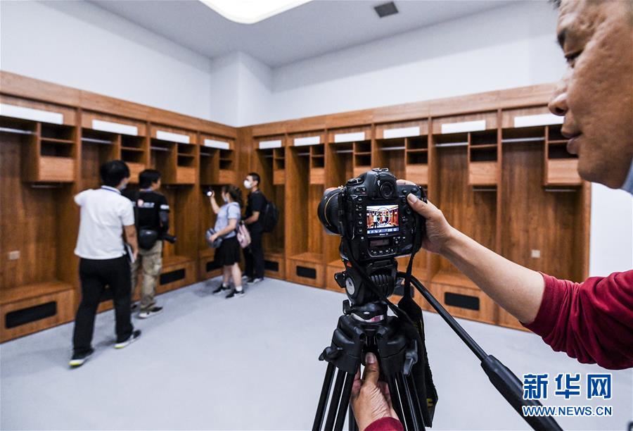 6月16日,在新疆烏魯木齊奧林匹克體育中心綜合體育館內(nèi),媒體從業(yè)者在拍攝運(yùn)動員更衣室。新華社記者 王菲 攝