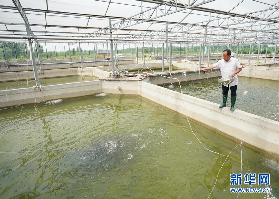 6月16日,在盧龍縣印莊鄉(xiāng)榆林甸村永新水產(chǎn)養(yǎng)殖專(zhuān)業(yè)合作社的養(yǎng)殖基地,養(yǎng)殖戶(hù)劉玉永在給淡水鱸魚(yú)投放飼料。