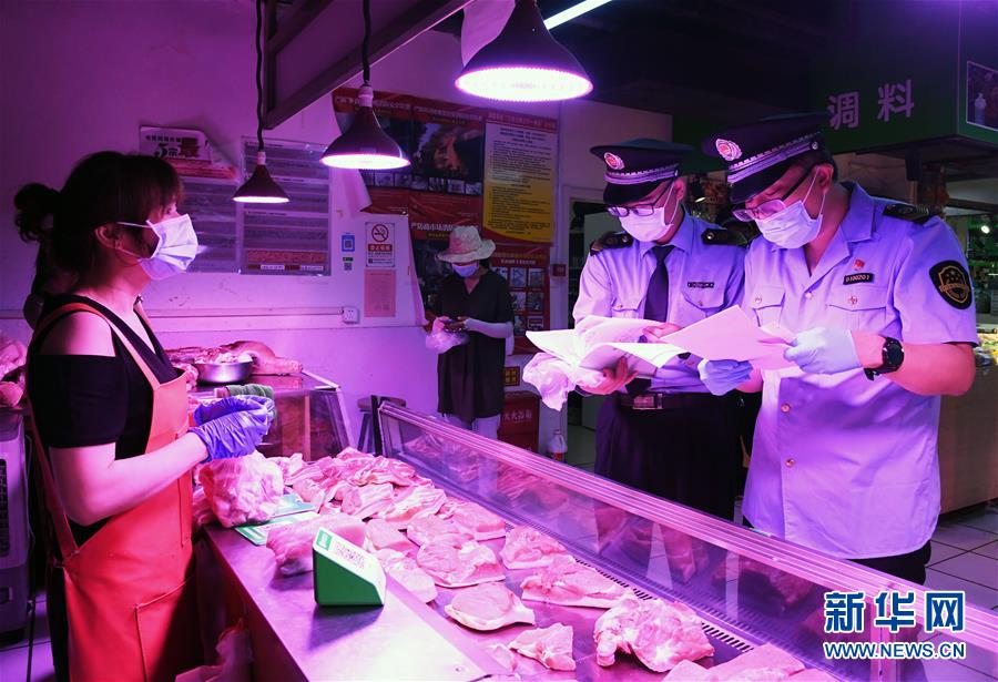 6月17日,在位于北京市海淀區(qū)的增光鴻運(yùn)市場,執(zhí)法人員對商戶所售鮮肉的進(jìn)貨渠道進(jìn)行檢查。新華社記者 任超 攝
