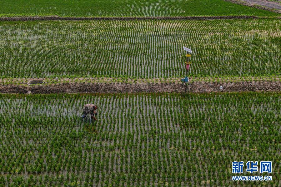 6月17日,農(nóng)民在盤錦市盤山縣太平街道張家村稻田間進(jìn)行管護(hù)作業(yè)。新華社記者 潘昱龍 攝