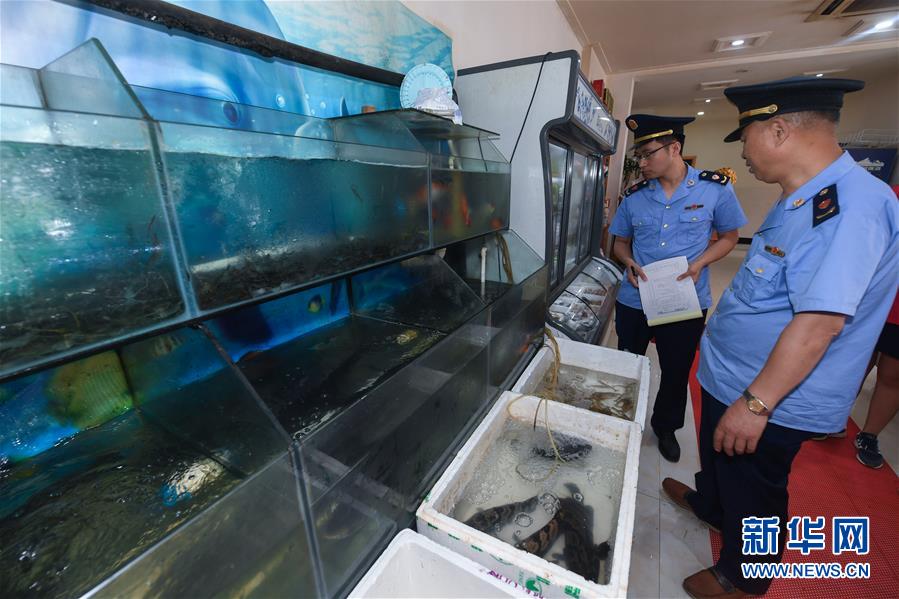 6月17日,市場監(jiān)管執(zhí)法人員在東林鎮(zhèn)農(nóng)貿(mào)市場開展專項執(zhí)法行動,檢查是否存在非法銷售野生動物的情況。新華社記者 徐昱 攝