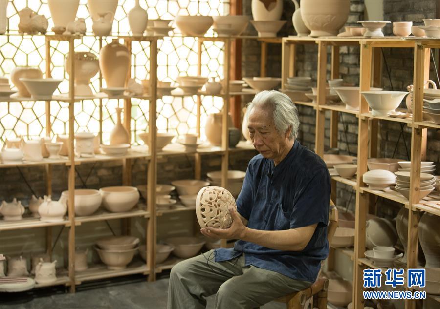 6月17日,在位于浙江慈溪的工作室,聞長慶查看一件素?zé)蟮难瑺t蓋。新華社記者 翁忻旸 攝